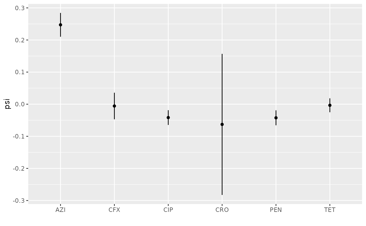 peb = ggplot2::ggplot(ebdf, ggplot2::aes(x = abx, y = Median, ymin = `2.5%`, ymax = `97.5%`) ) + ggplot2::geom_errorbar(width=0) +