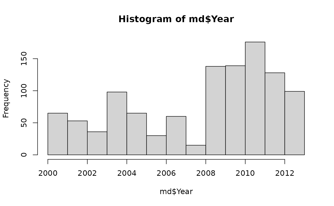 hist( md$Year, title = '', ylabel = '', xlabel = 'Year' )